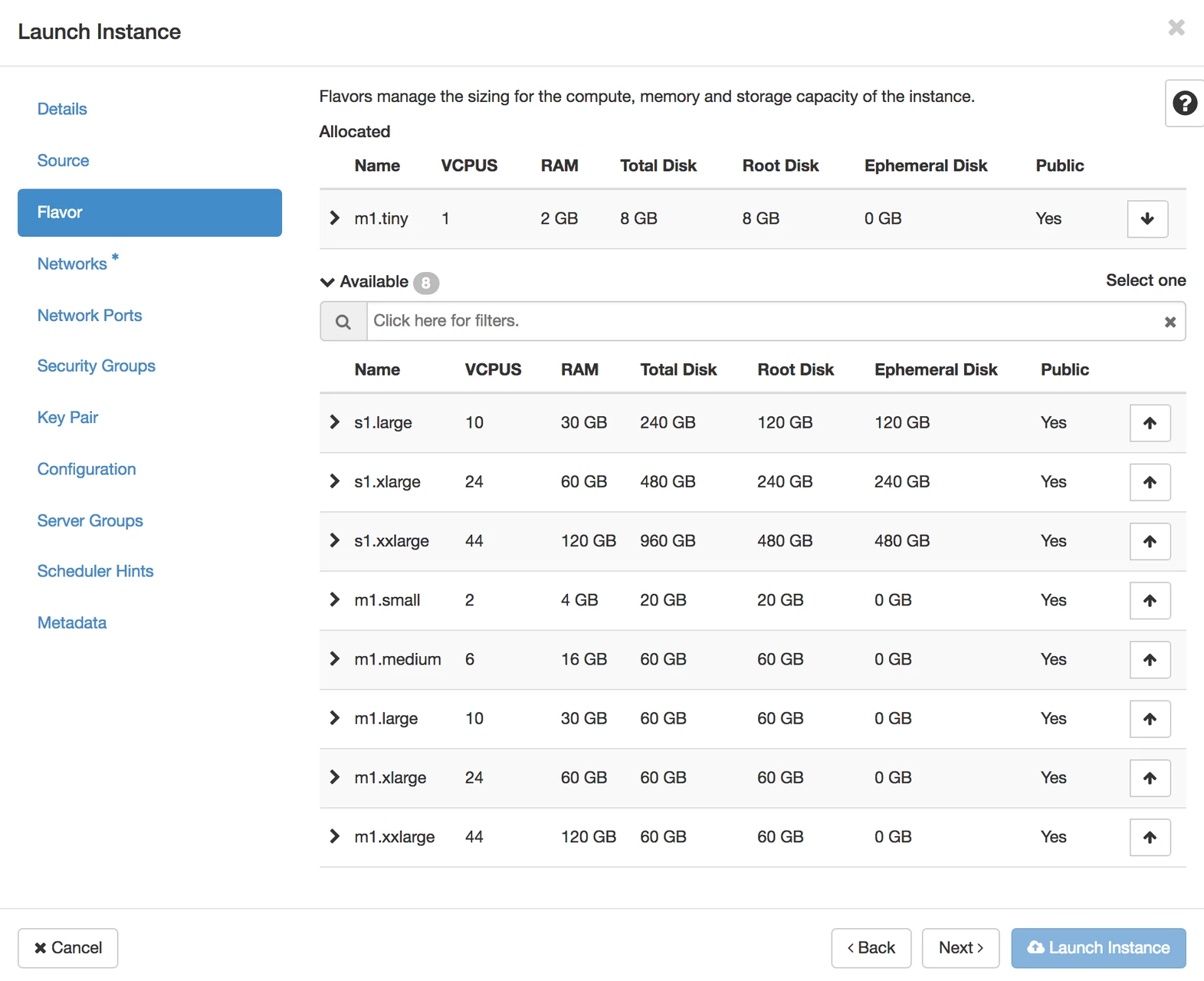 Flavorscreen, select the size VM you want to use and click the arrow to the right of its description.Like the previous screen, you’ll see it move up into theAllocatedarea towards the top of the box. -