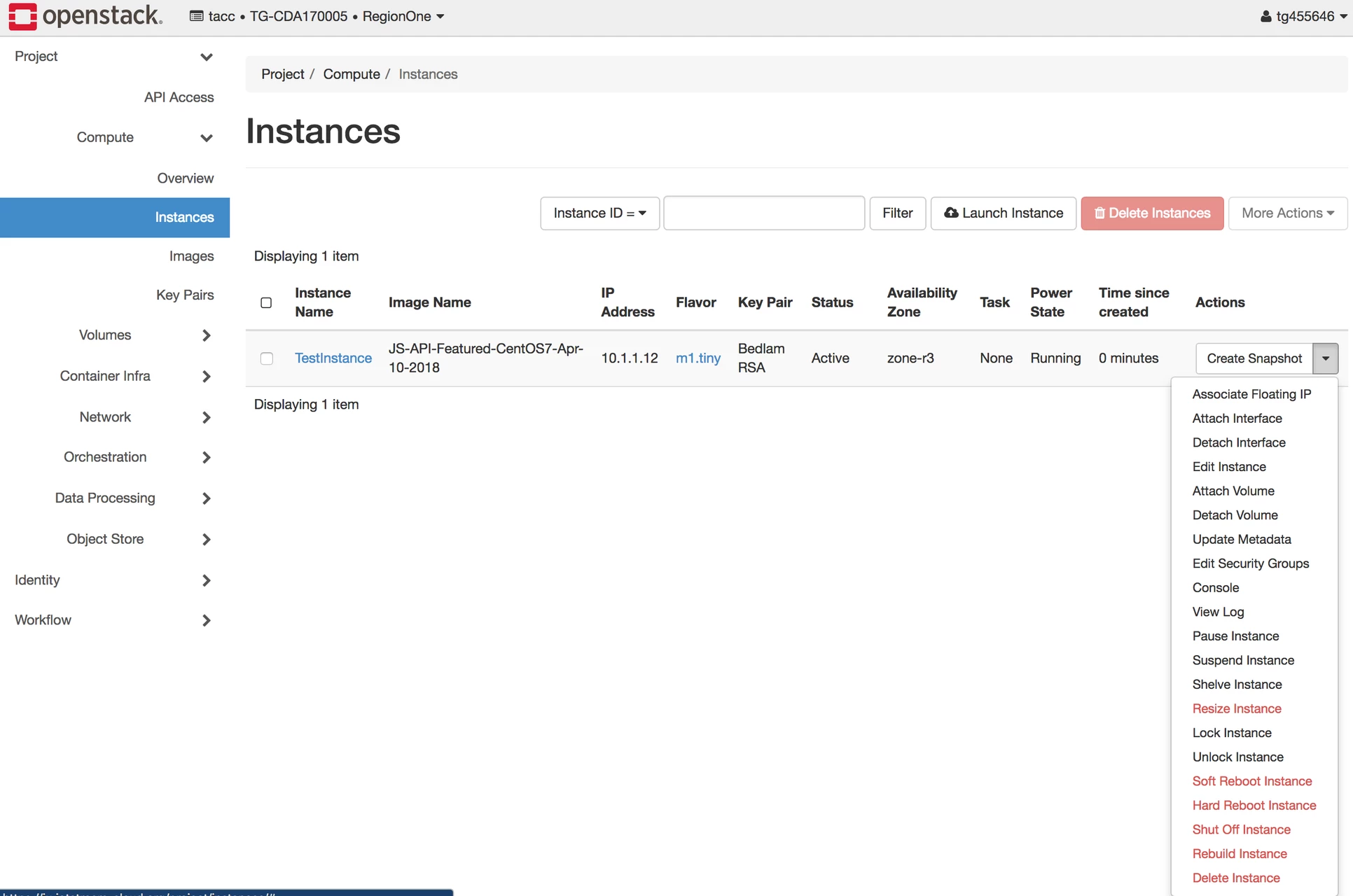 network,security group, andssh keyssetup, you should be ready to launch an instance. - On the left side bar, click on