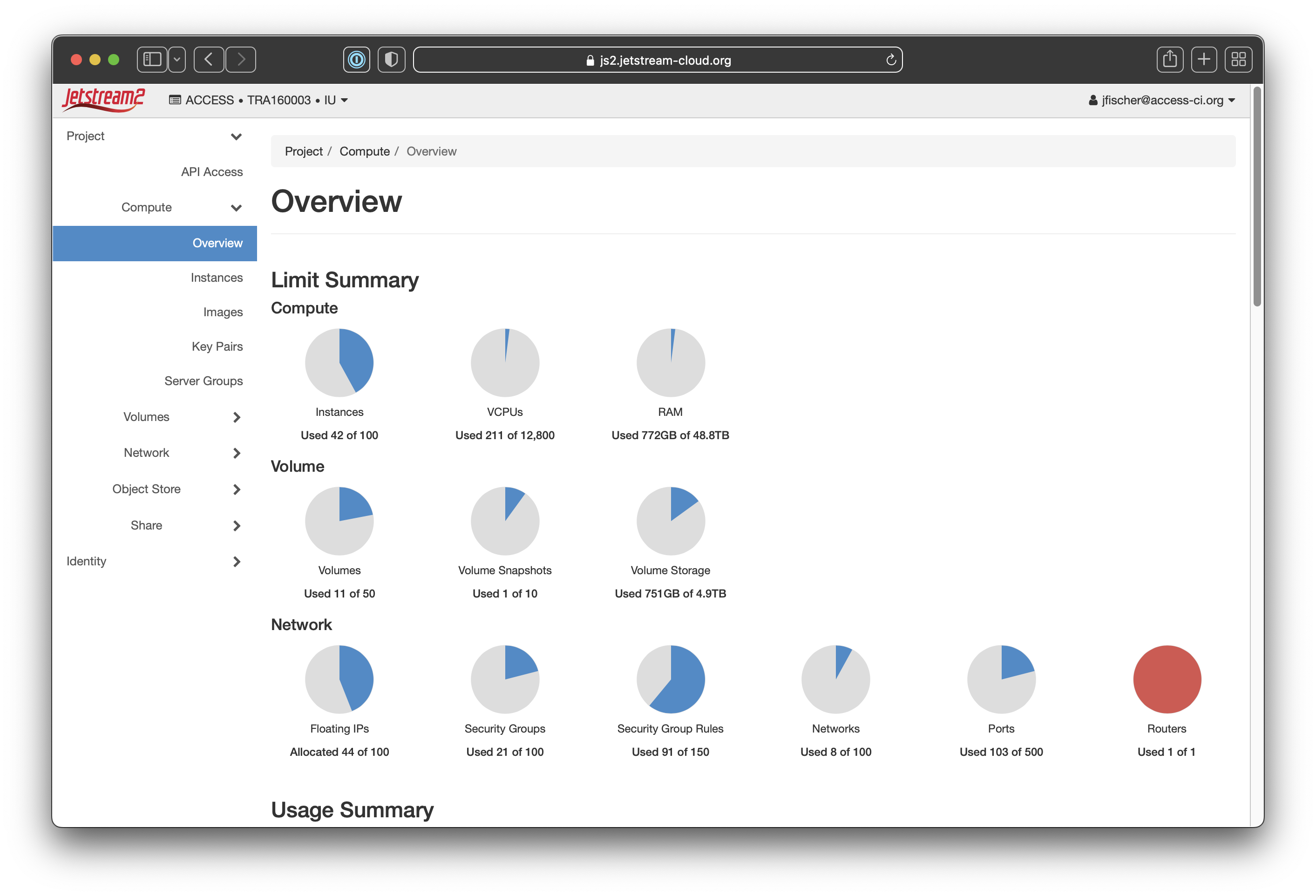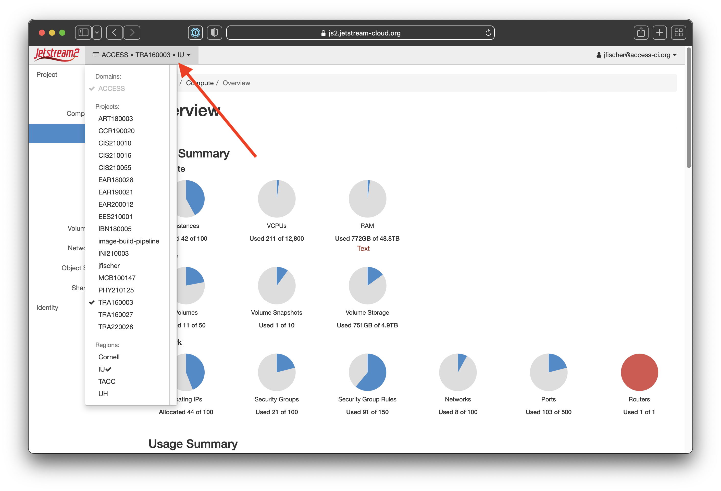 You do that by clicking at the top left next to the Jetstream2 logo where it has ACCESS • AAA000000 • IU. That will show allocations under “Projects”.
