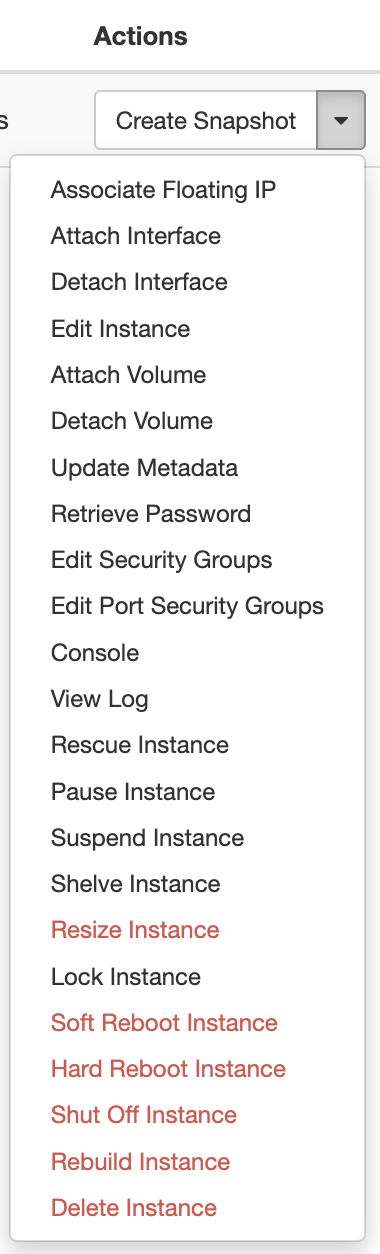 After launching an instance (On the left side bar, click on Project → Compute → Instances), several options are available under the Actions menu located on the right hand side of your screen.