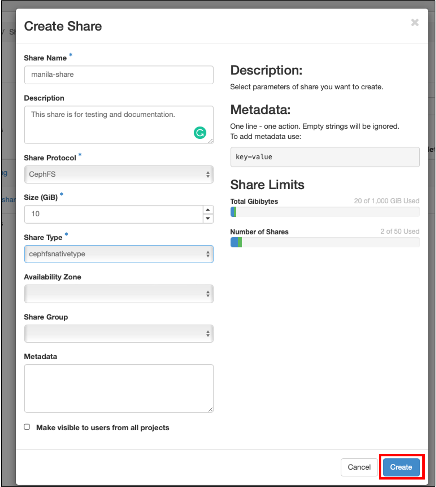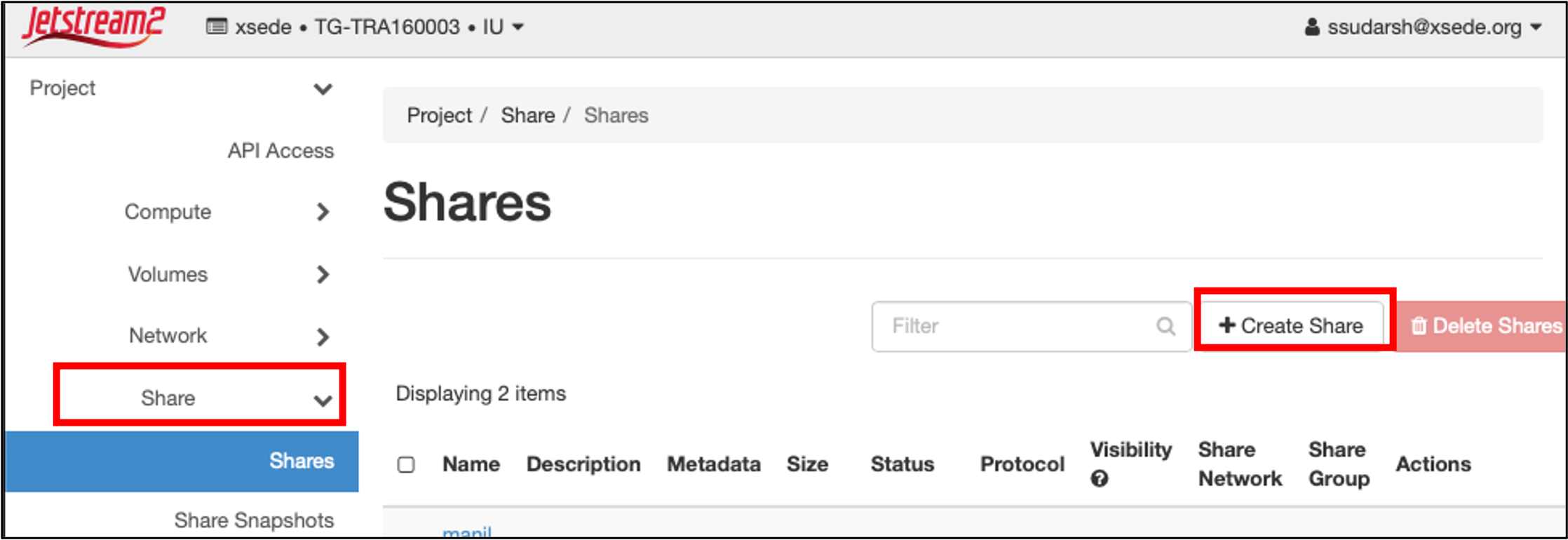 i. Click on: Project → Share → Shares → +Create Share