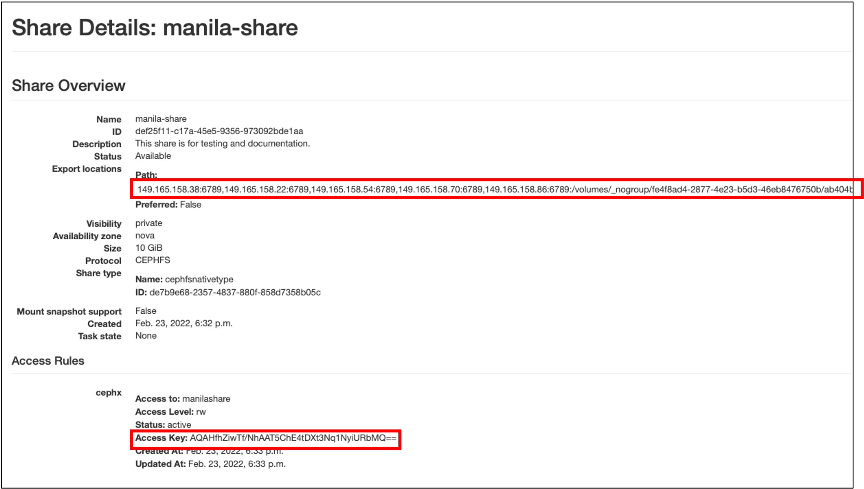 In the example above the accessTo name is manilashare.The name assigned must be globally unique! If you use a name that is already in use you will see an error state. To help avoid accidental overlap, we recommend prefixing your name with something unique such as your ACCESS username or your allocation number. For example, instead of using just seed-research, use <ALLOCATION>-seed-research.