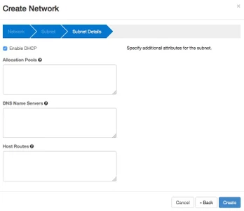 Enable DHCPbox unless you are familiar with setting the advanced features of OpenStack networks, subnets, and routers.