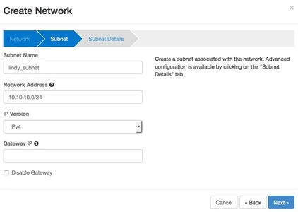 <username>_subnet, and a network address, e.g.10.1.1.0/24, and a gateway address, e.g.10.1.1.1.- This should be a non-routable subnet.