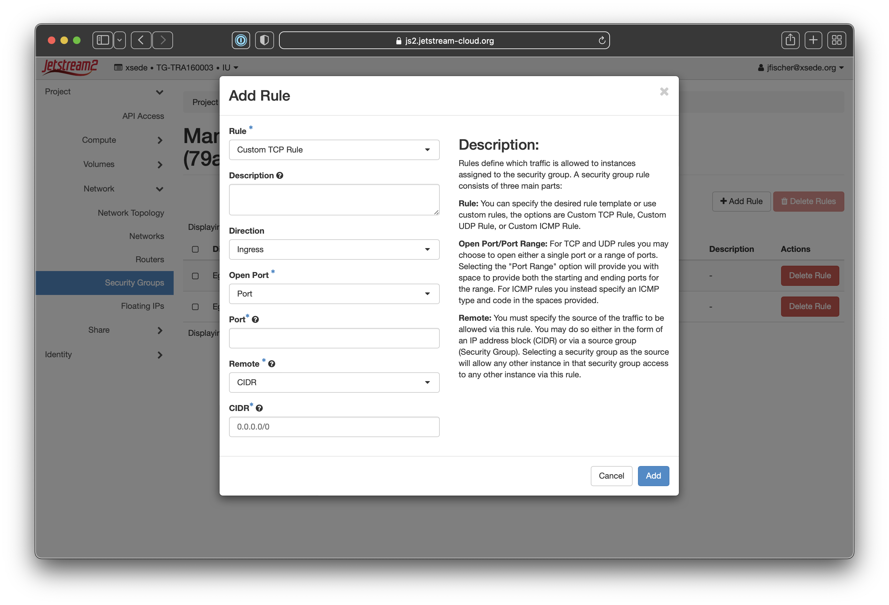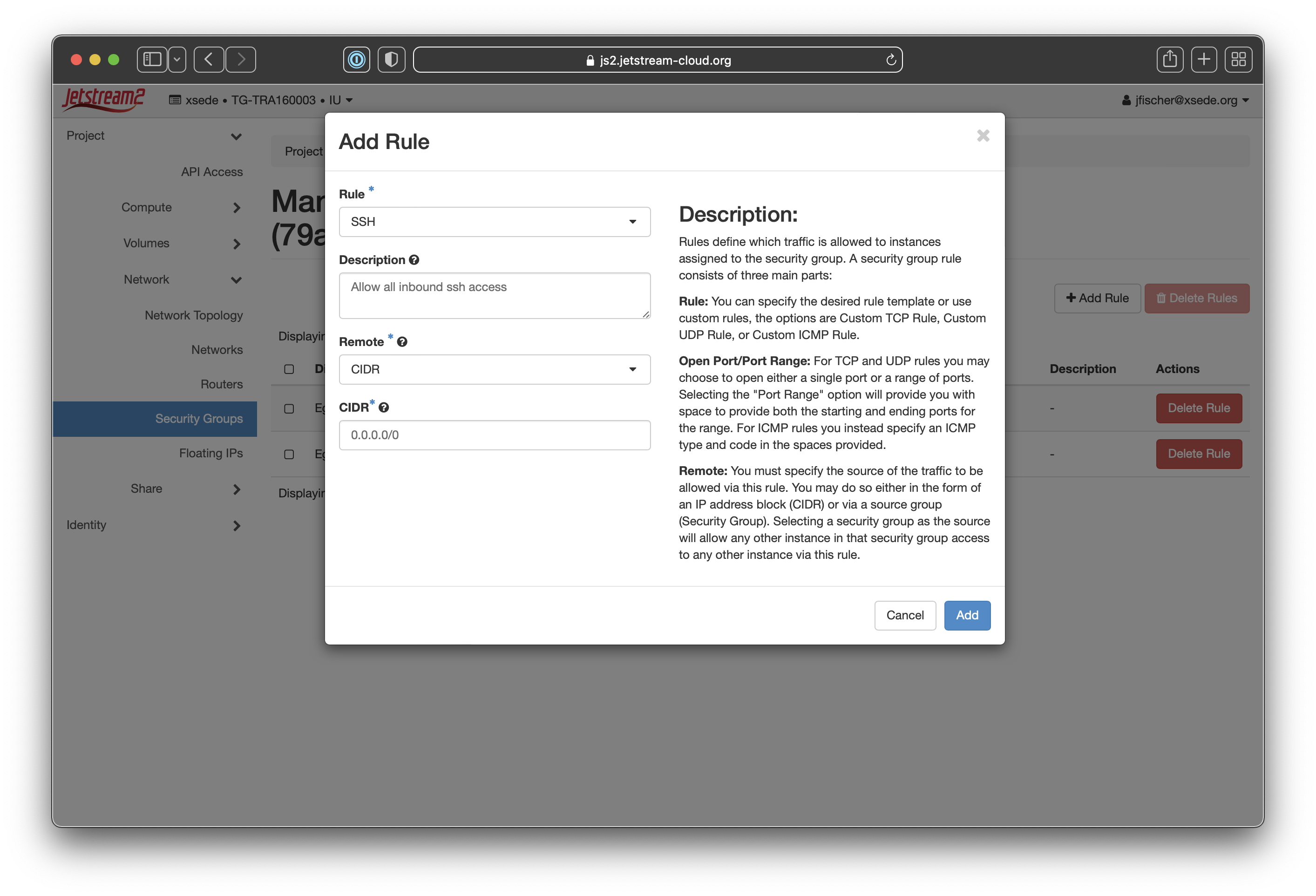 For example, you could specify 129.114.36.0/22 to limit connections to only Jetstream2 VMs at the TACC regional location.