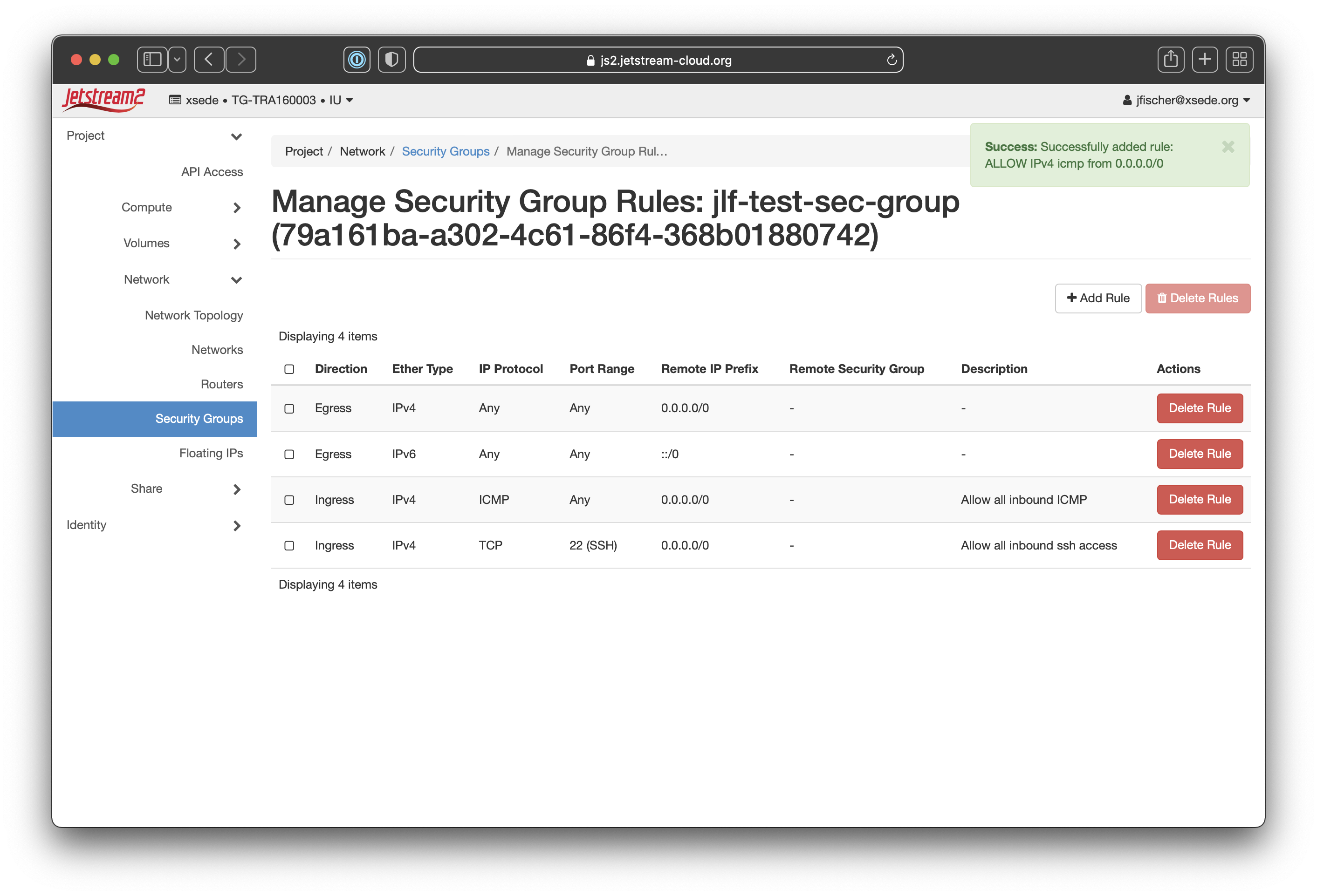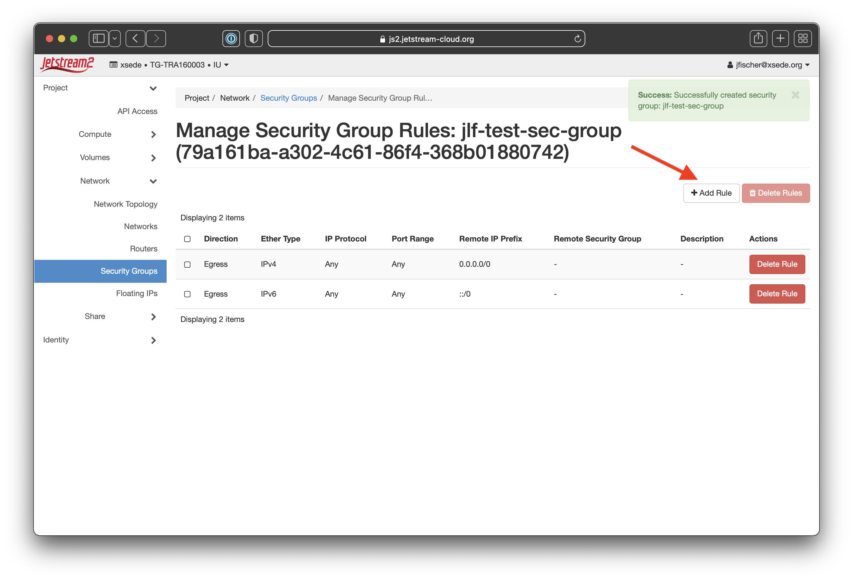 - When the creation is successful, it will bring you back to the security group page and note the success in the corner with a green status message. You’ll see your new group name at the top where it says Manage Security Group Rules: your-rule-name.You’ll then want to click