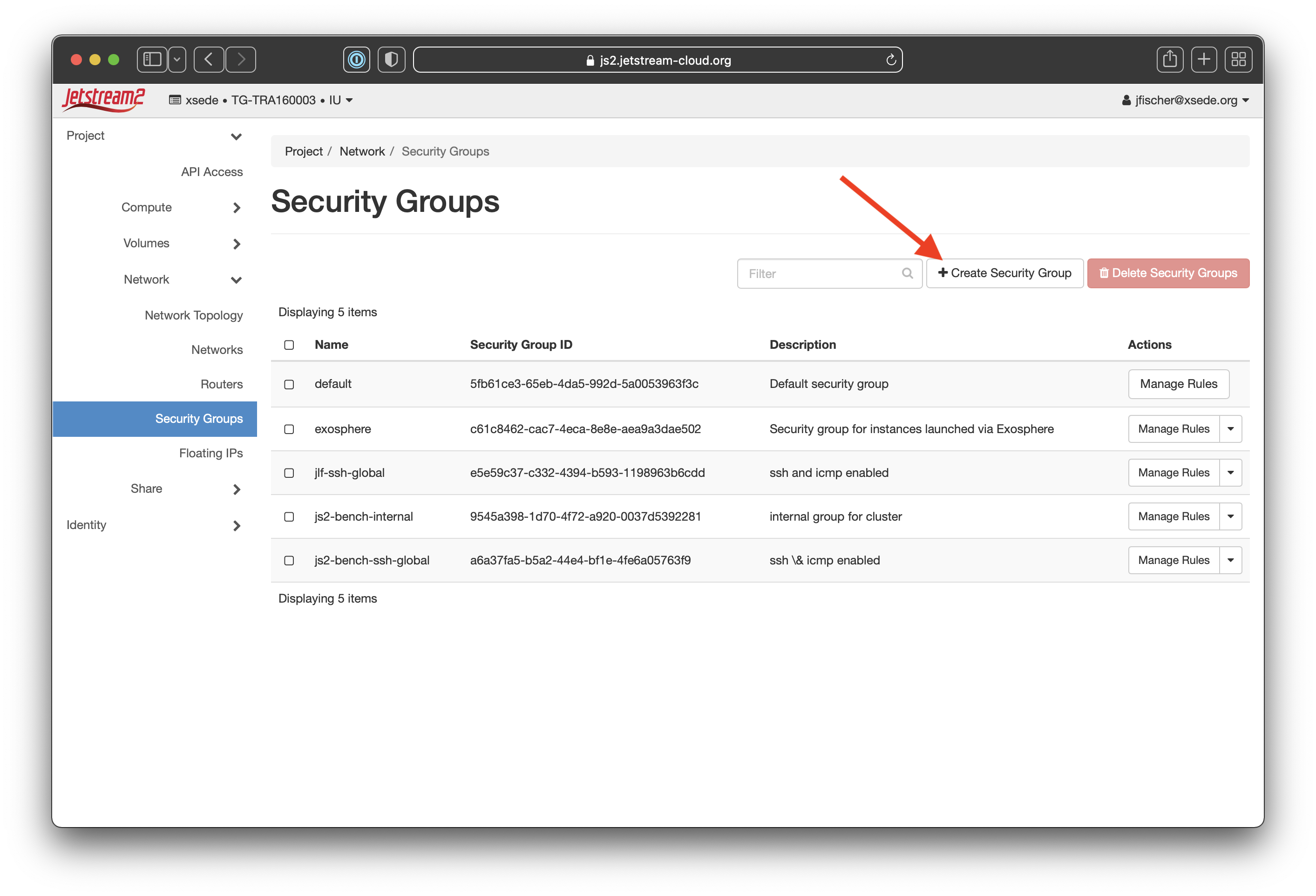 Create Security Groupbutton (noted with a red arrow on the screenshot).